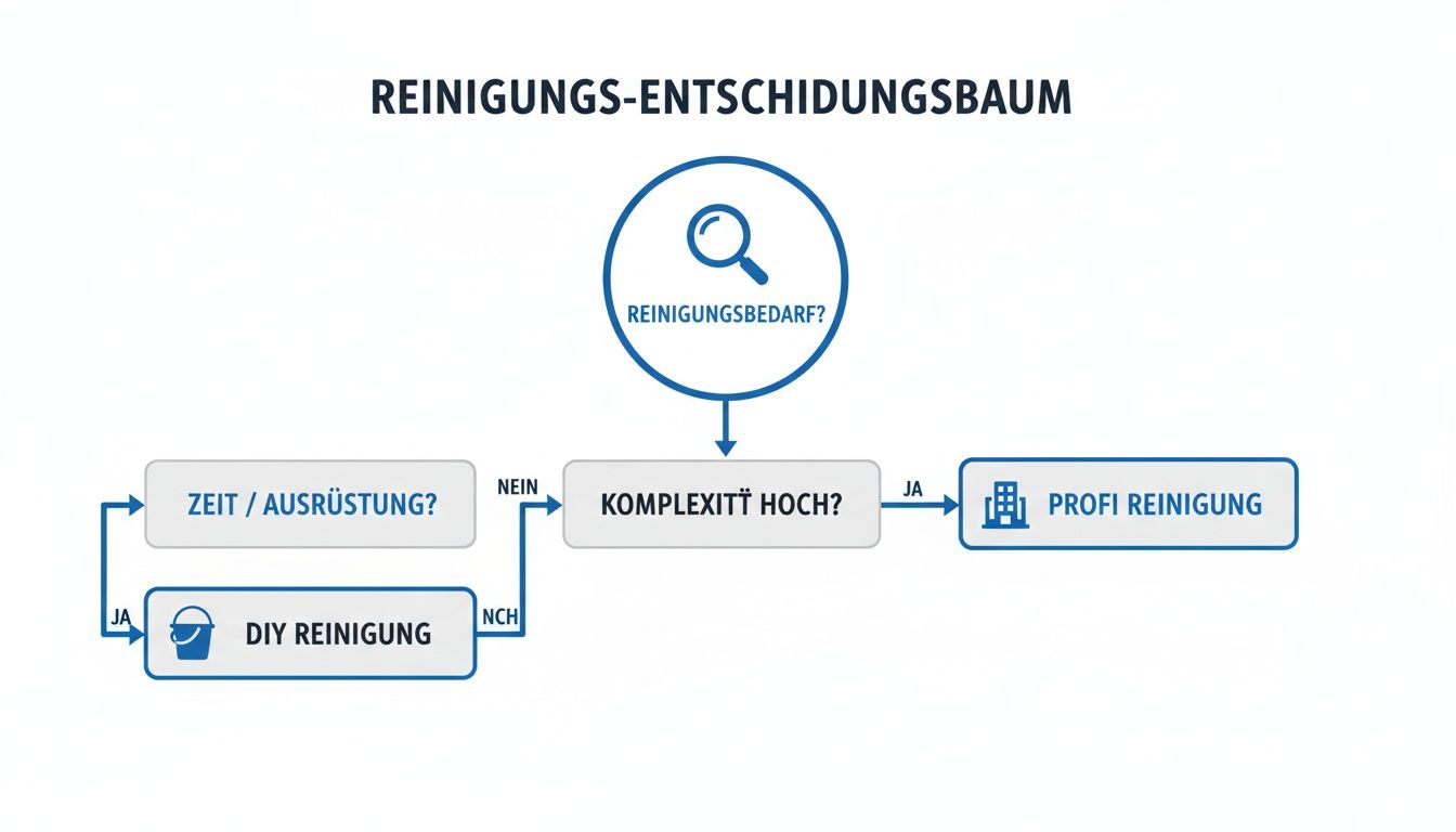 Ein professioneller Service wie unserer bietet hingegen Sicherheit und Effizienz. Unser kleiner Entscheidungsbaum zeigt Ihnen, welcher Weg für Ihre Situation beim Thema Umzug und Reinigung wohl der passendere ist.